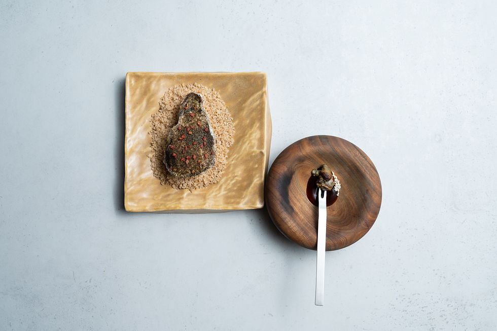 That shift occurred when I came across the book Brae, detailing the work of the restaurant in Melbourne. I was fascinated by their radical approach to oysters as ice cream. Inspired, I set out to create my own version, blending the robust Kochi oysters with the saline depth of kelp from Rameshwaram. To contrast the cold, oceanic cream, I needed a counterpoint of heat and texture. I developed a Pandi kari crumble for a spicy, fatty crunch, paired with the concentrated bite of charred oyster meat. To finish, I applied a glaze made from the mushrooms of Fungamental in Bangalore, adding a layer of deep umami that anchored the entire dish.